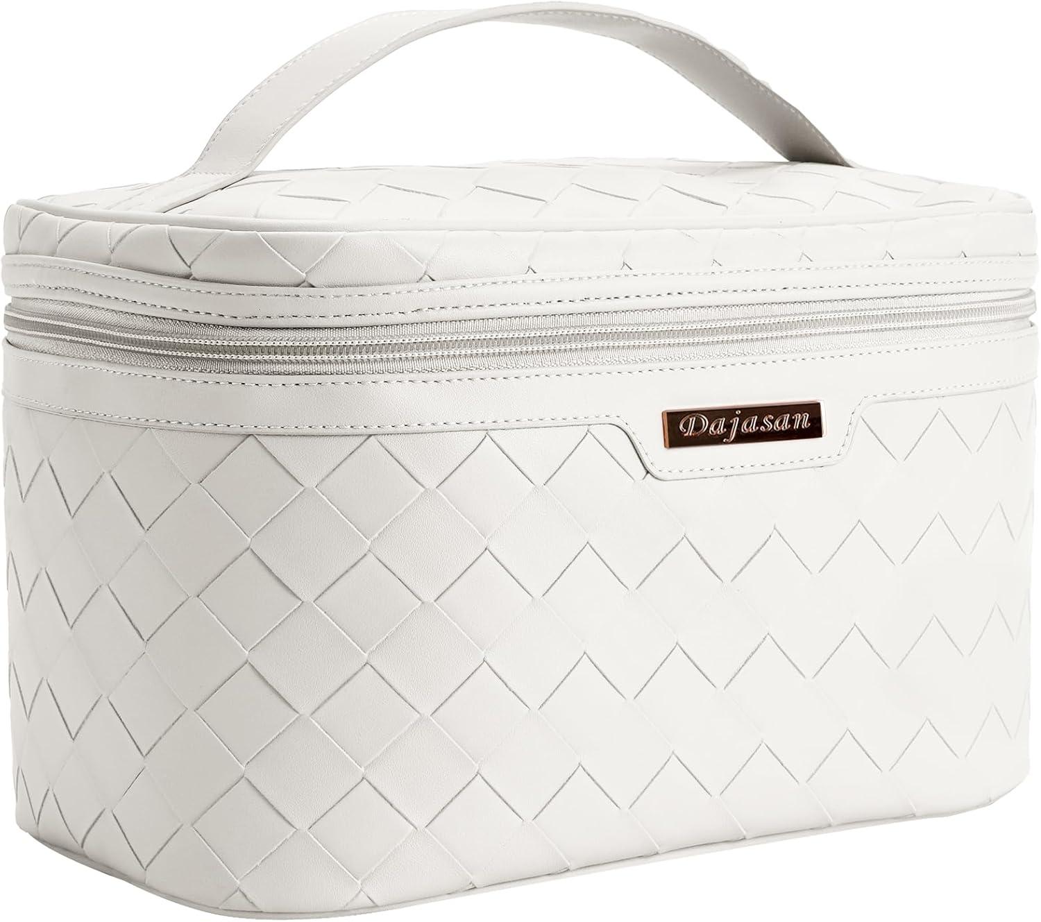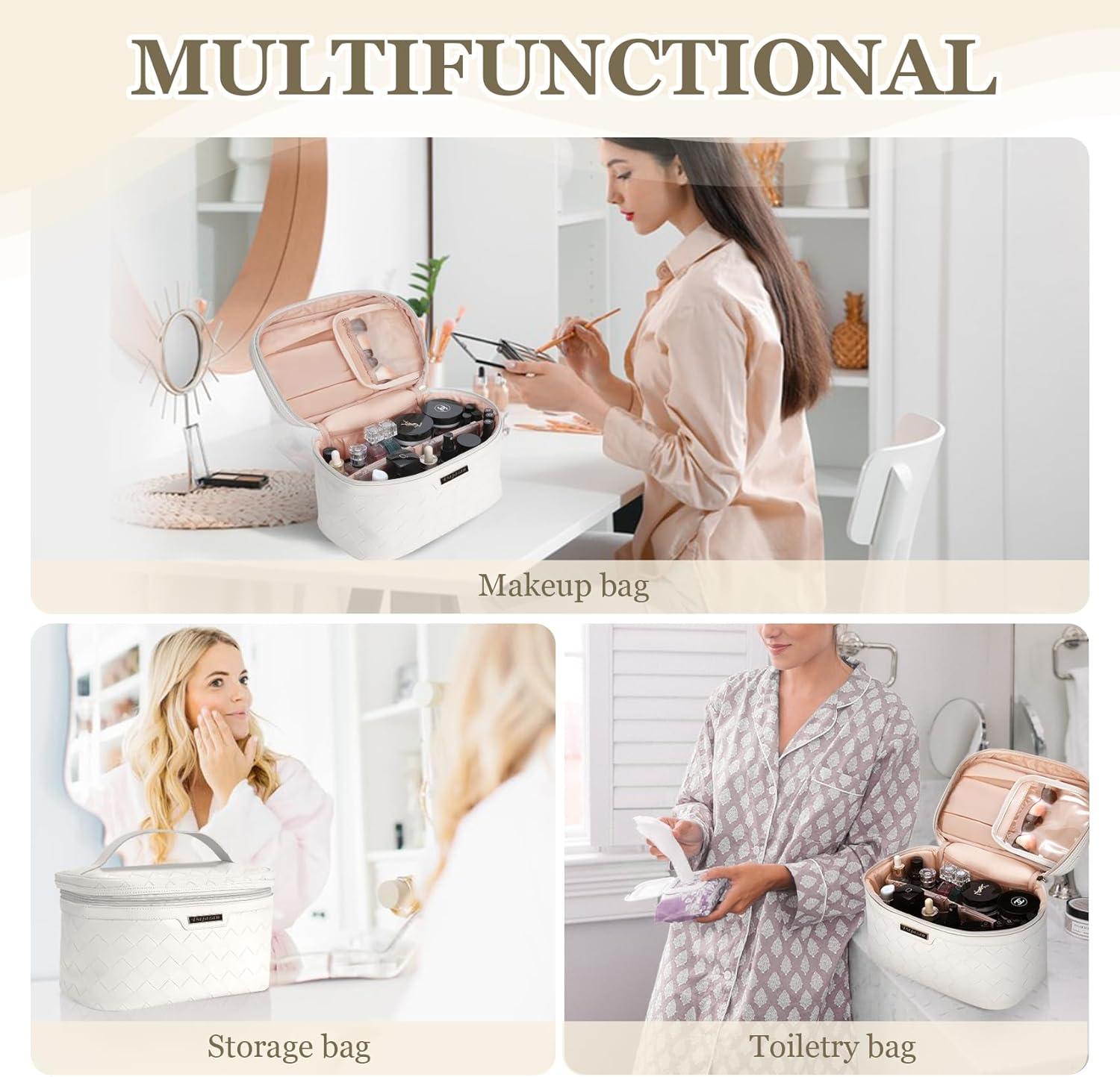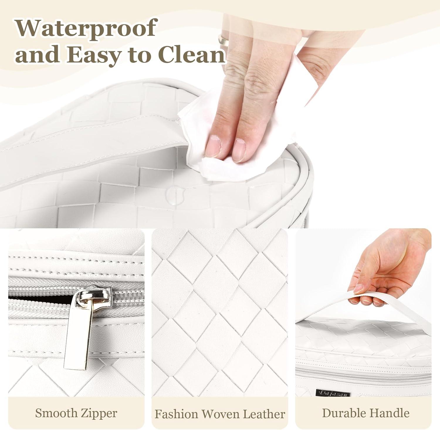 【Fashional and Durable】: This large makeup bag is made of high-quality PU leather and has excellent durability, water resistance, allowing you to use it for a long time. The surface design of the make up bag is a diagonal woven pattern and is equipped with a smooth metal zipper. Exquisite and stylish yet practical.