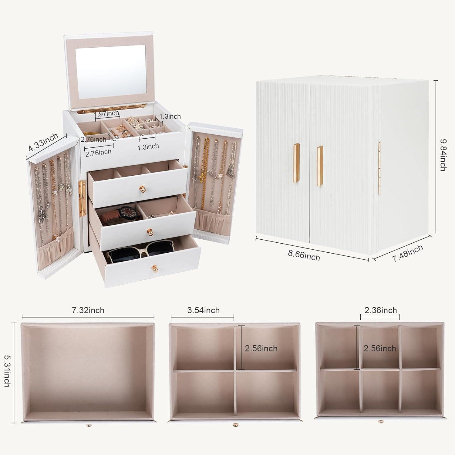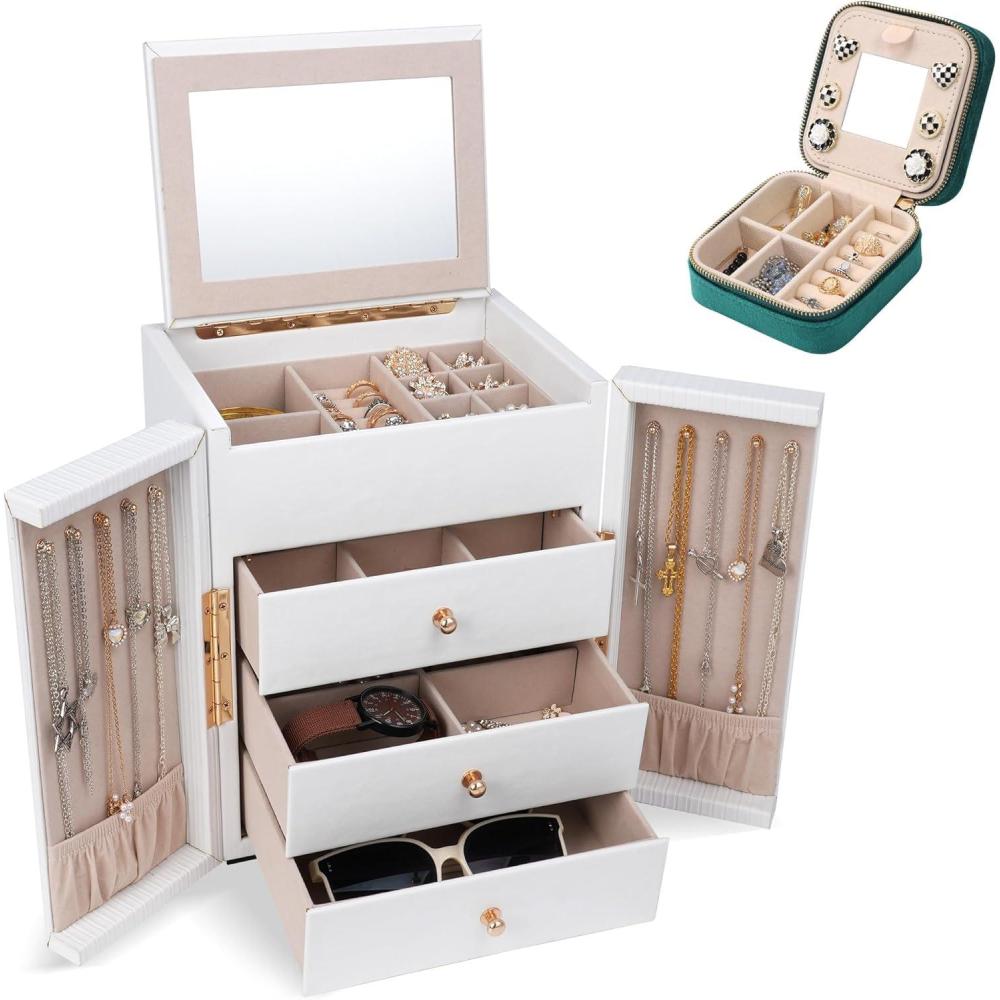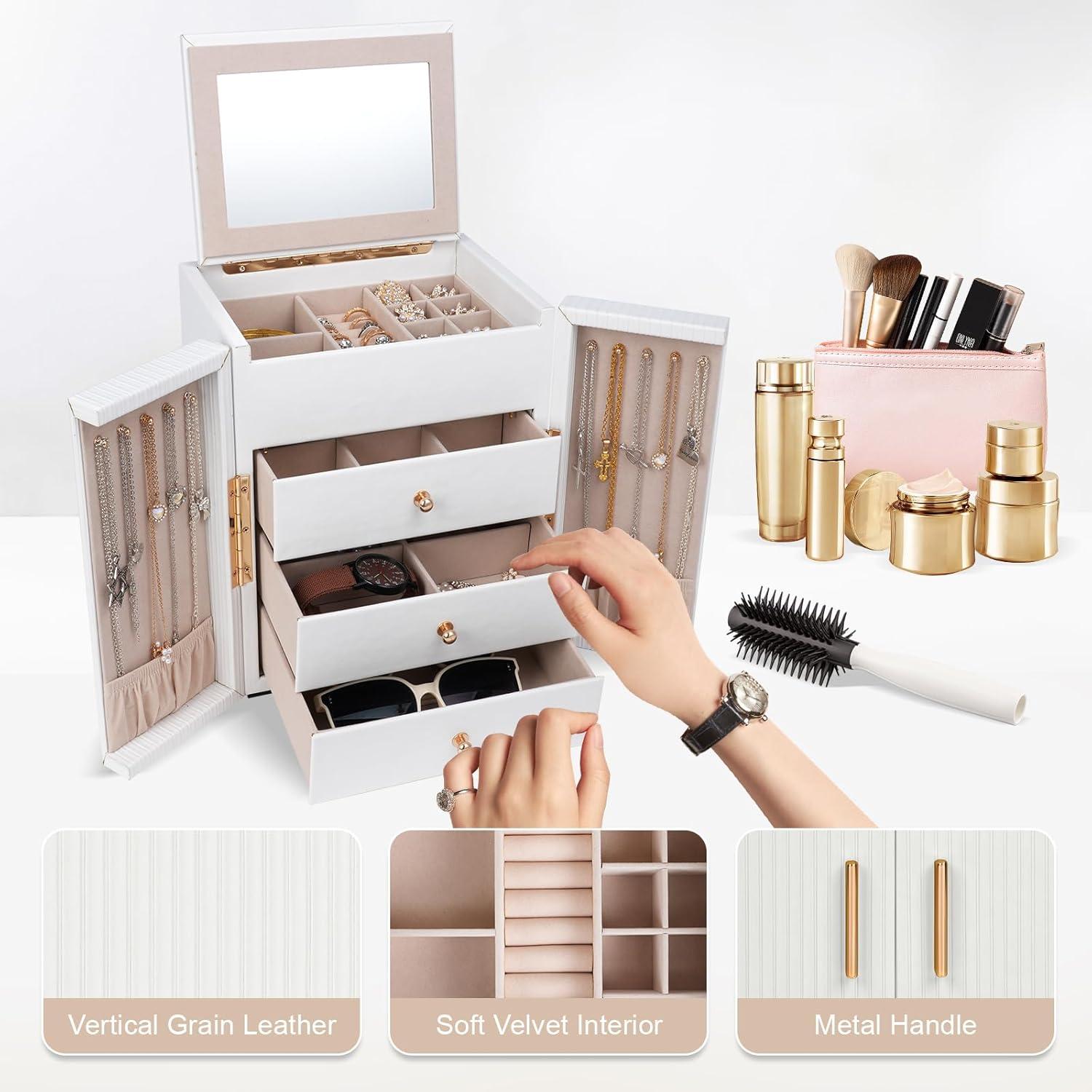 Style Upgrade: The unique double door design of the large jewelry box makes it easy for you to open and adds a sense of ceremony when using. The combination of vertically textured leather and exquisite hardware accessories not only enhances the overall aesthetics of the jewelry organizer, but also adds texture and grade