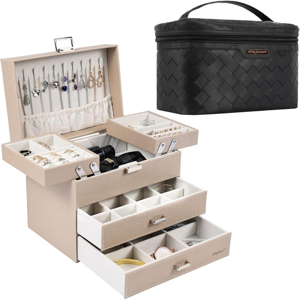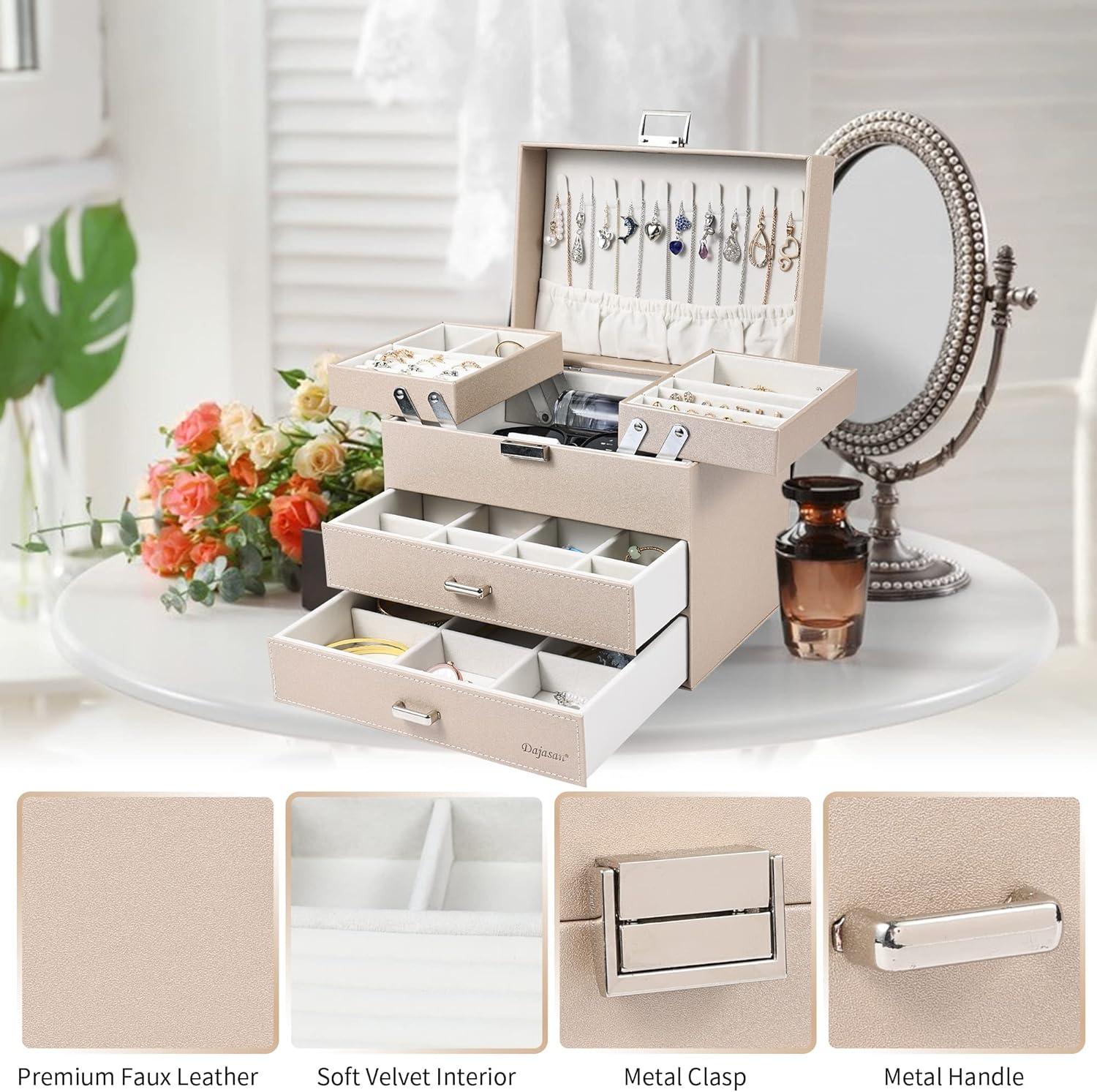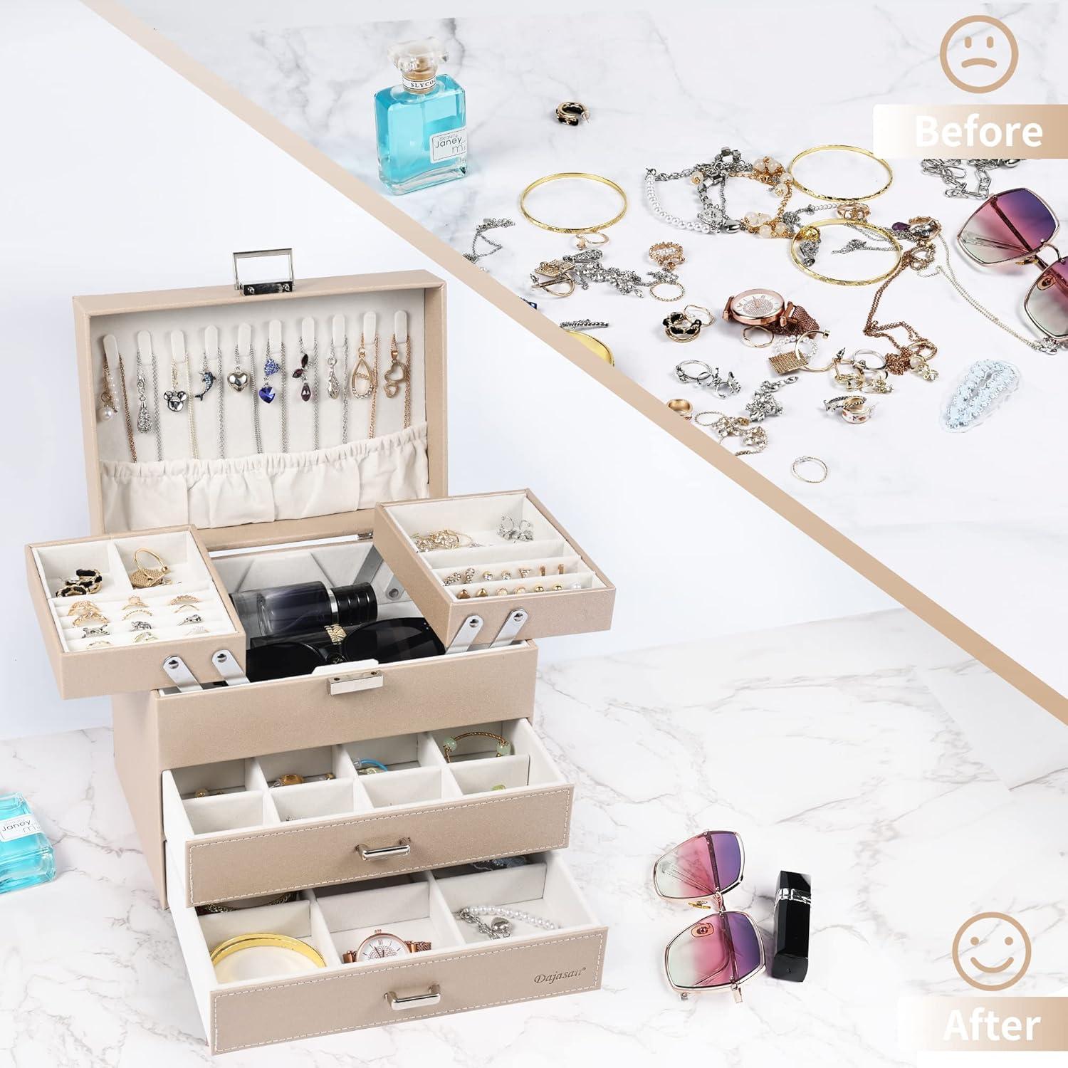 【Space-Saving Jewelry Organizer】: With our leather jewelry box, all your jewelry will be organized and easy to access. From then on, you have a bright dressing table that makes your room look more tidy and elegance. Moreover, the classification design of our large jewelry box organizer allows you to reduce the search time.