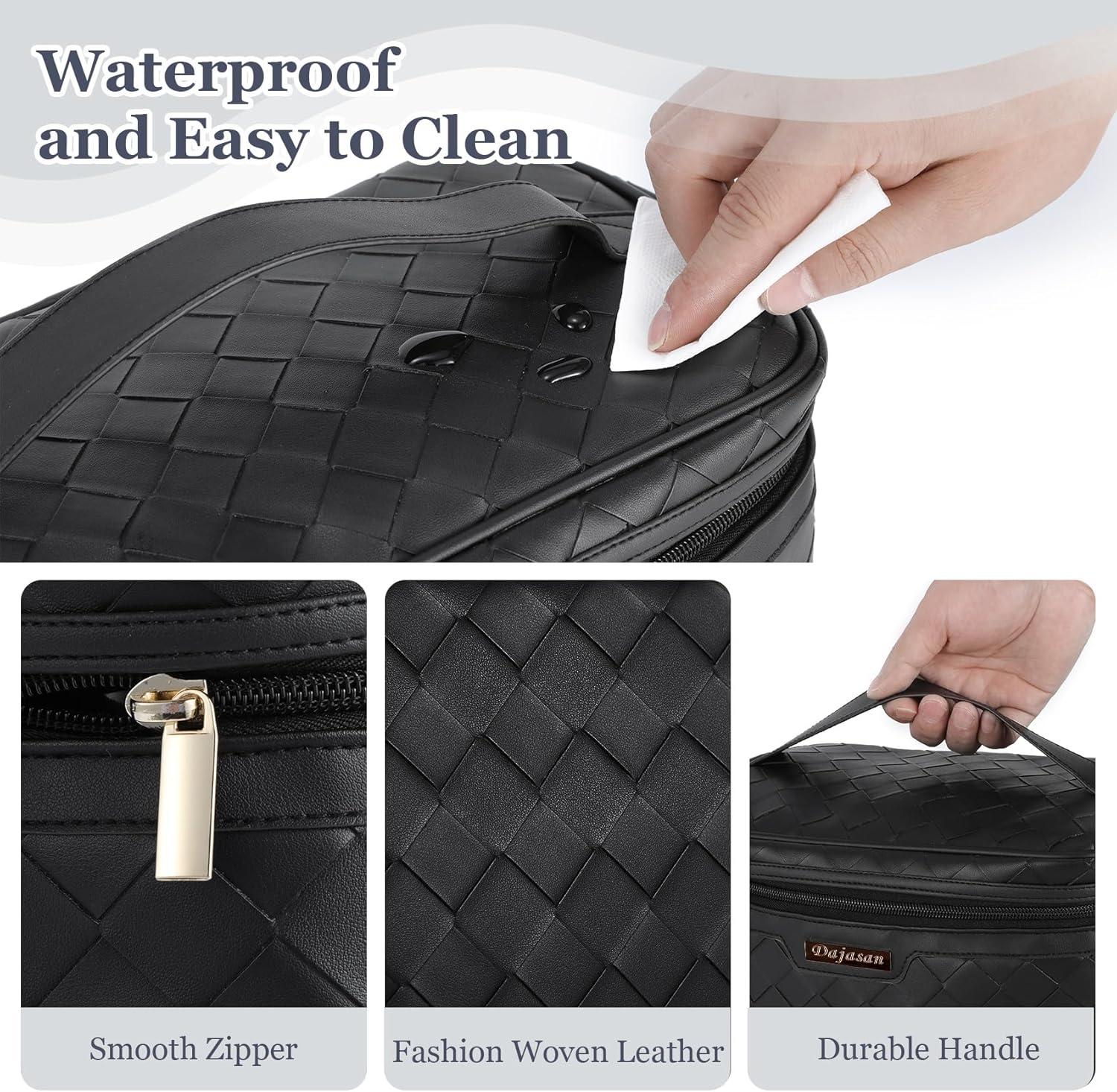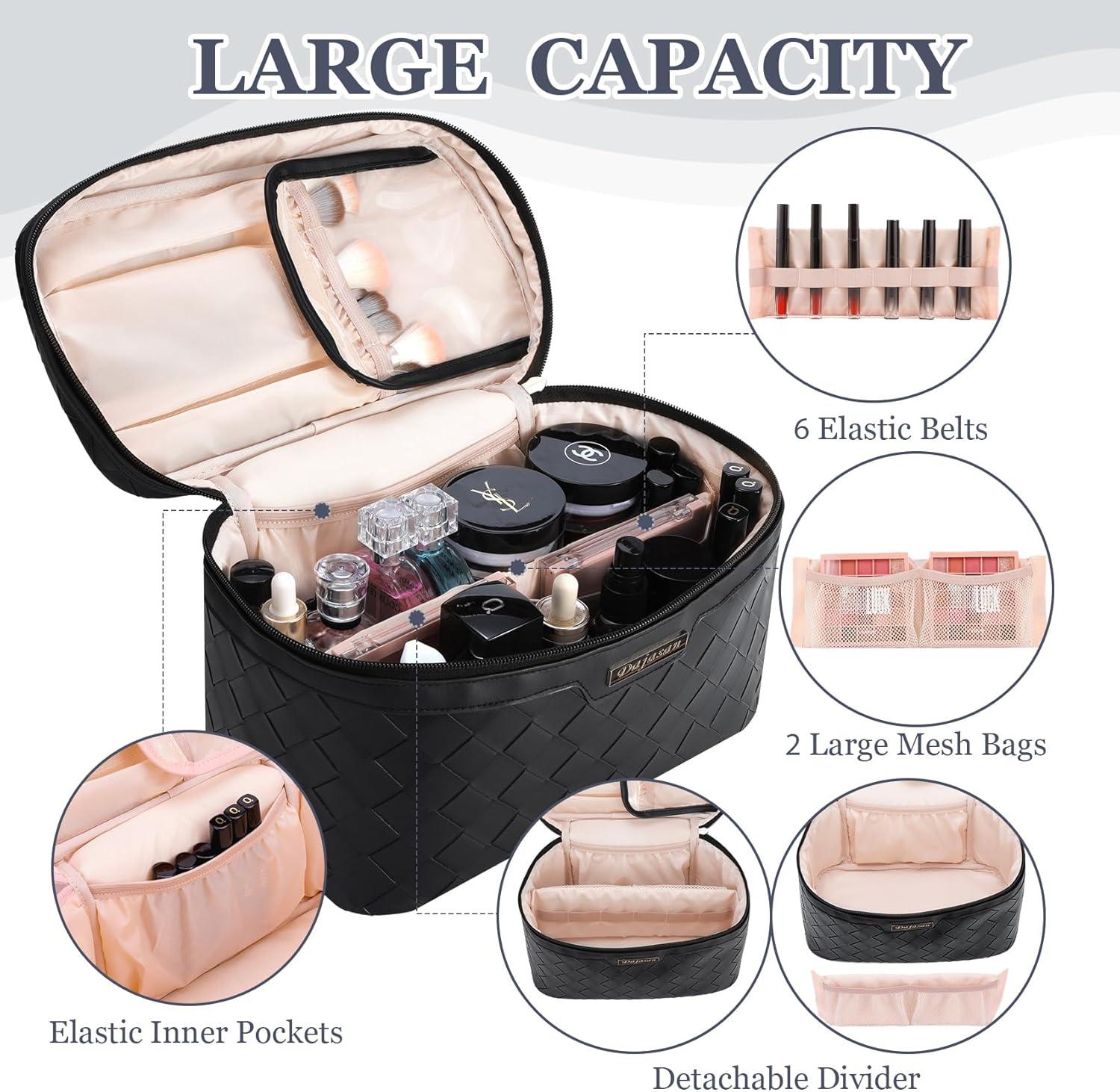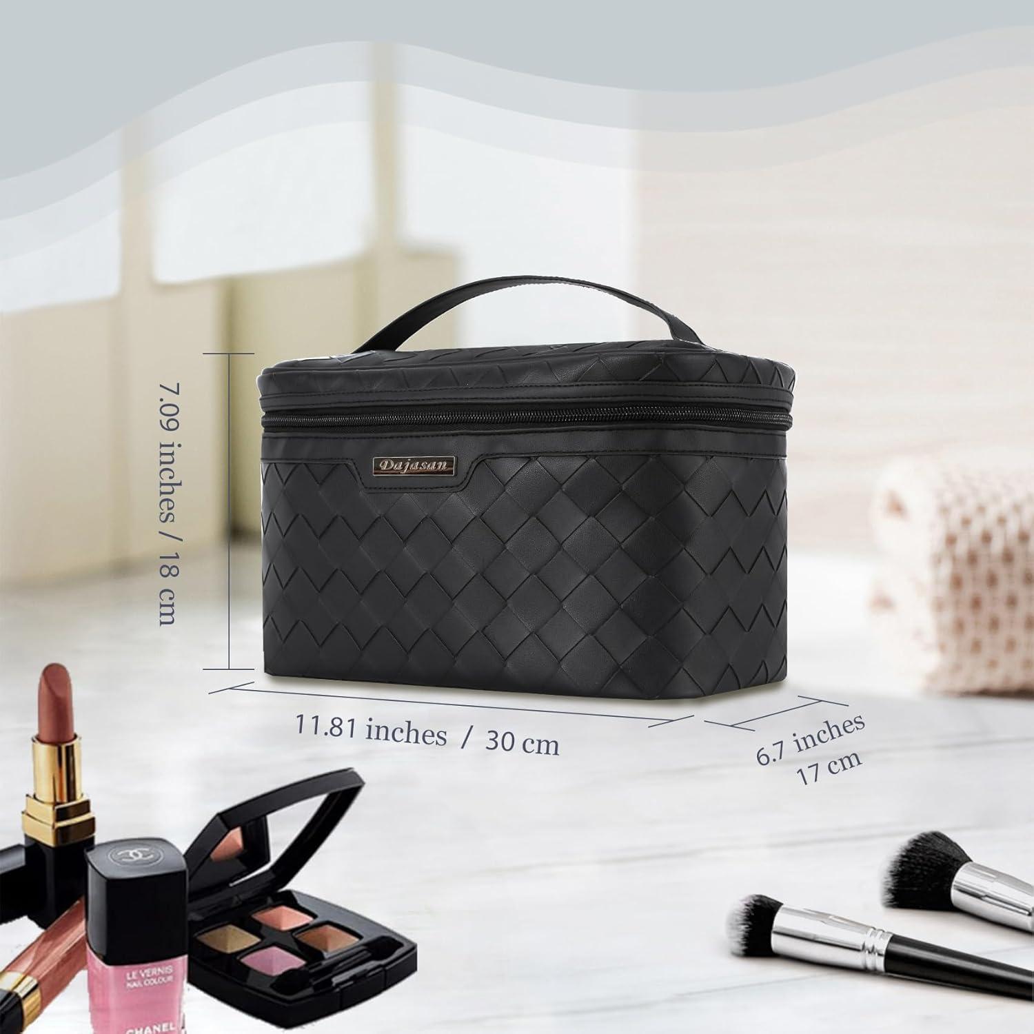【Fashional and Durable】: This large makeup bag is made of high-quality PU leather and has excellent durability, water resistance, allowing you to use it for a long time. The surface design of the make up bag is a diagonal woven pattern and is equipped with a smooth metal zipper. Exquisite and stylish yet practical.
